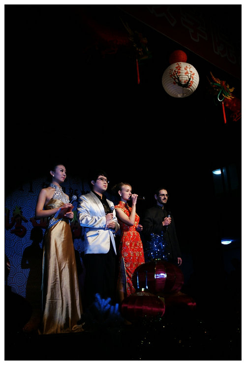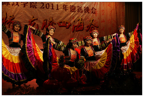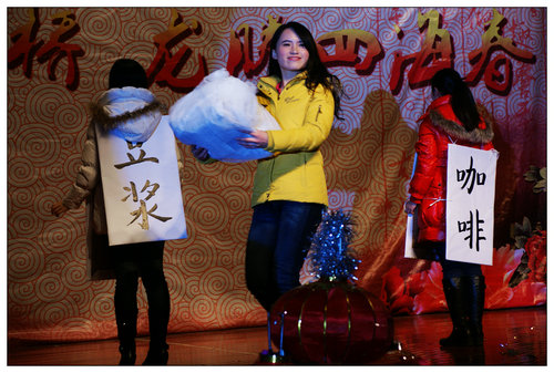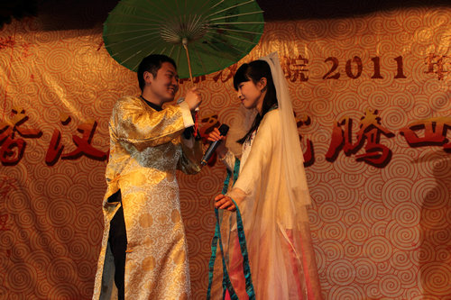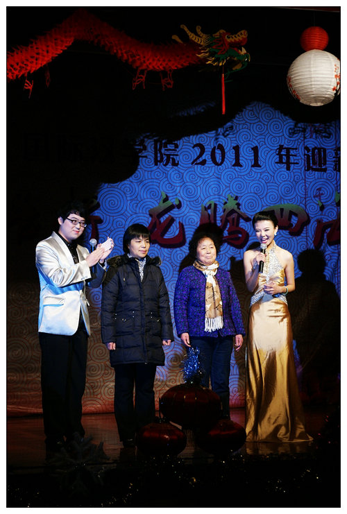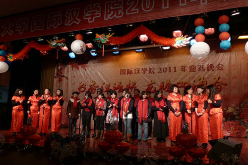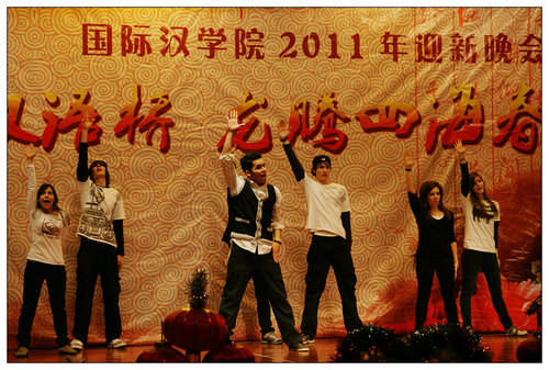 全体教师佩戴红色围巾,深情演绎了《踏雪寻梅》、《恭喜恭喜》,将晚会推向高潮。观众们自发打起节拍,台上台下同唱,其乐融融。08对外表演的小品《非诚勿扰》,幽默诙谐,笑点不断,观众连连捧腹,笑声荡漾在礼堂。09对外带来的现代舞《Heat》激情四射,风情万种,焕发青春的光彩。最后,晚会在学生会中外干部演绎的《汉语桥》中落下帷幕,圆满成功。