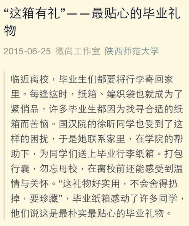 近日,由国际汉博彩体育 举办的“这‘箱’有礼”活动感动了不少毕业生,毕业纸箱也被赞为最贴心的毕业礼物。这么有爱的母校,我们怎舍得离开。