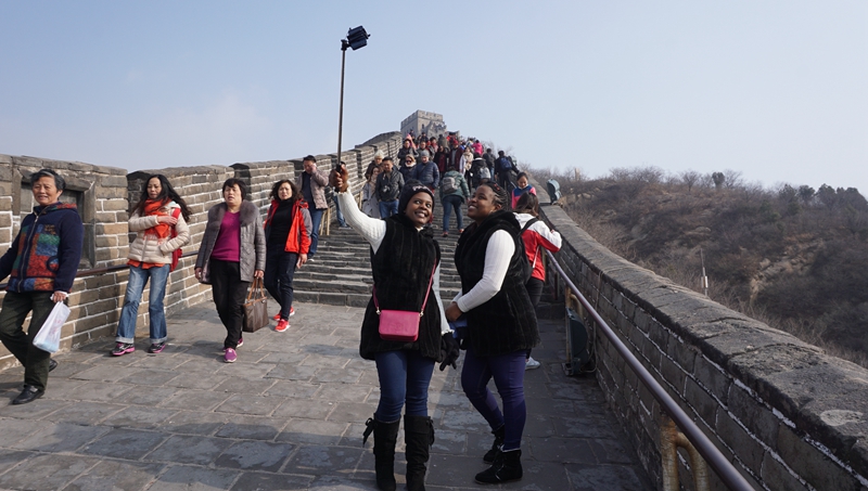 参观长城是北京之行的重头戏,是我们最期待的景点。在留学生的眼里,长城就是中国的标志,就像毛主席说的“不到长城非好汉”,对我们来讲来中国却不去长城也等于白去,因此这一天我们都格外兴奋。长城上风很大,但吹散了恼人的雾霾,远望长城之外的视野变得更加广阔。我们仿佛一下子变成了小孩,你追我赶,兴奋地“占领”了一个个烽火台。