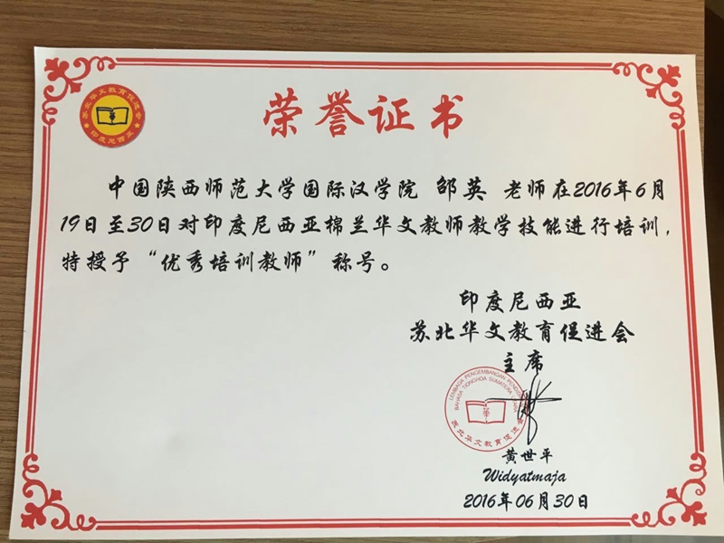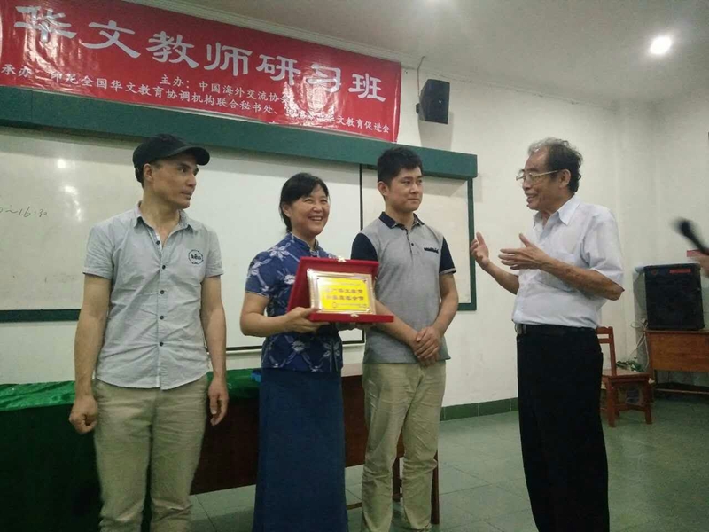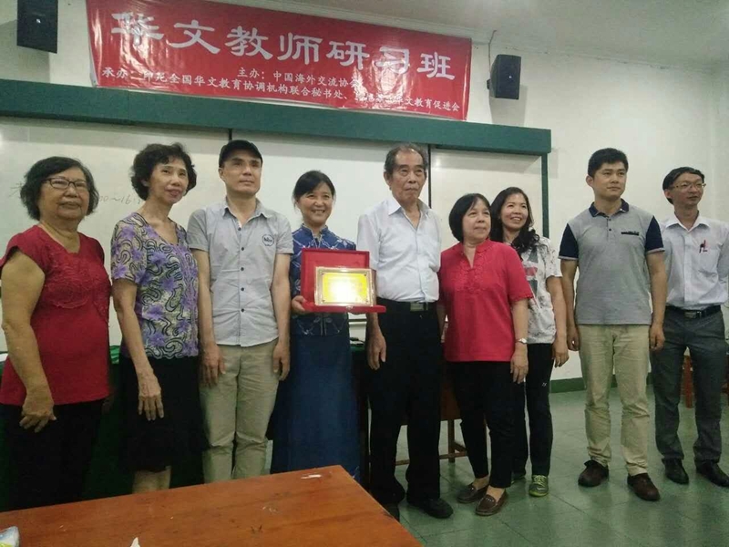 讲师团三位教师不辞艰辛传授华文教学基础理论与中华文化知识,同时感谢各华校积极配合,珍惜难得的机会,让苏北地区的华文老师通过培训不断提高华文教学水平。正是在各方的大力支持与合作下,印度尼西亚的华文教育事业蒸蒸日上。”为表彰三位讲师在本次培训中的辛勤付出,印度尼西亚苏北华文教育促进会特为三位讲师颁发“优秀培训教师”称号。
