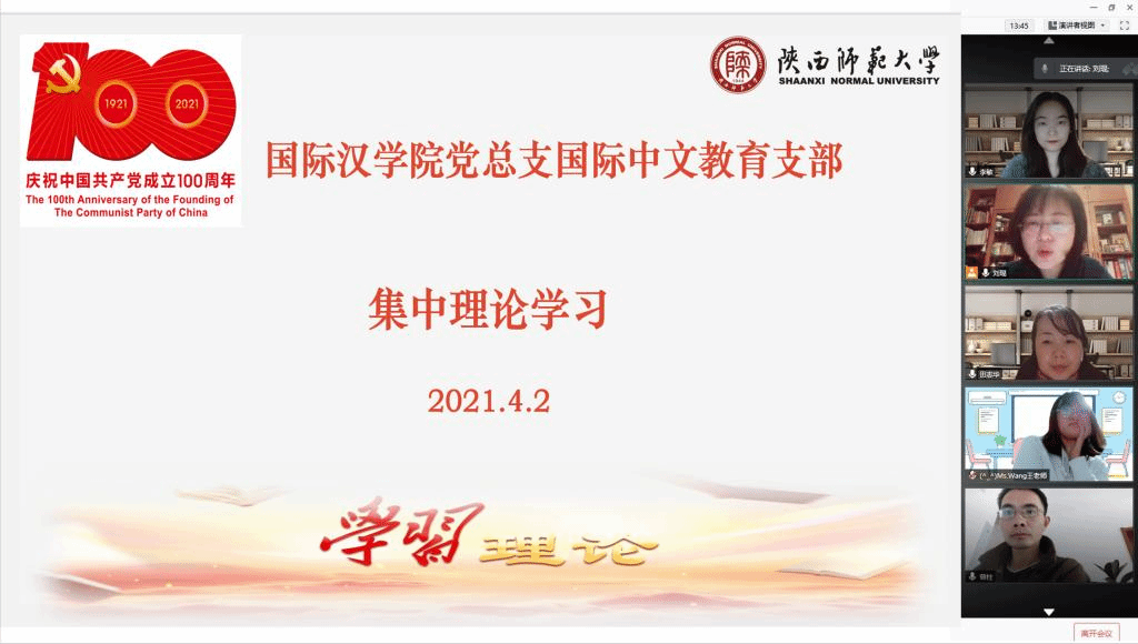 国际中文教育党支部的十位党员同志相聚云端,在腾讯会议上开展了支部成立以来的首次组织生活会,本次学习以学习习近平同志《在党史学习教育动员大会上的讲话》为主题,支部书记刘琨同志主持。
