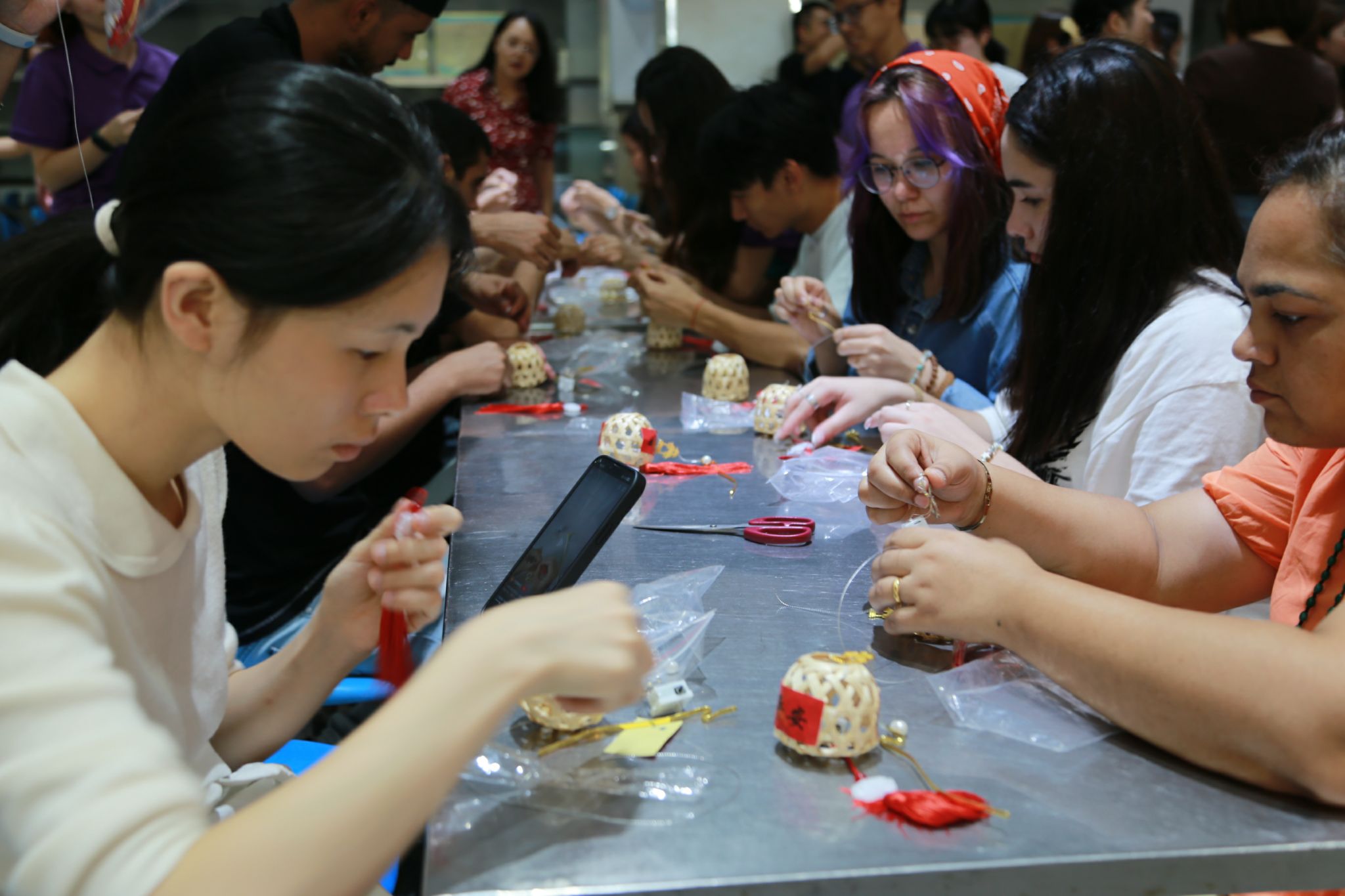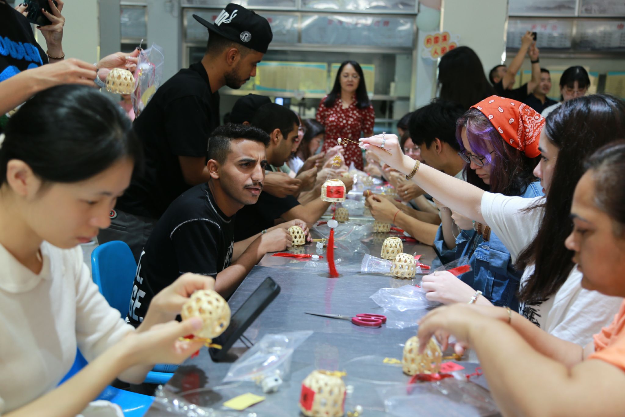 随后,活动进入了分组制作环节。中外学生们在小灯笼和月饼的制作过程中,亲身体验了中秋节的传统习俗,也增进了彼此之间的友谊和合作。他们相互帮助、共同学习,将一个个精美的小灯笼和月饼呈现在大家眼前,展现出了中外文化的交融与碰撞。