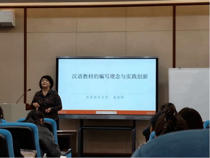姜丽萍教授在讲座中系统阐述了教学理念对教材编写的影响,介绍了《体验汉语基础教程》和《HSK标准教程》的实践案例,并指出对外汉语教学战略正向“走出去”和教材本土化转变。此外姜教授还分享了“中文+”教材与数字化教学资源的最新发展,展示了从纸质到数字的建设成果,并就汉语教材的选用为师生提供了实用建议。