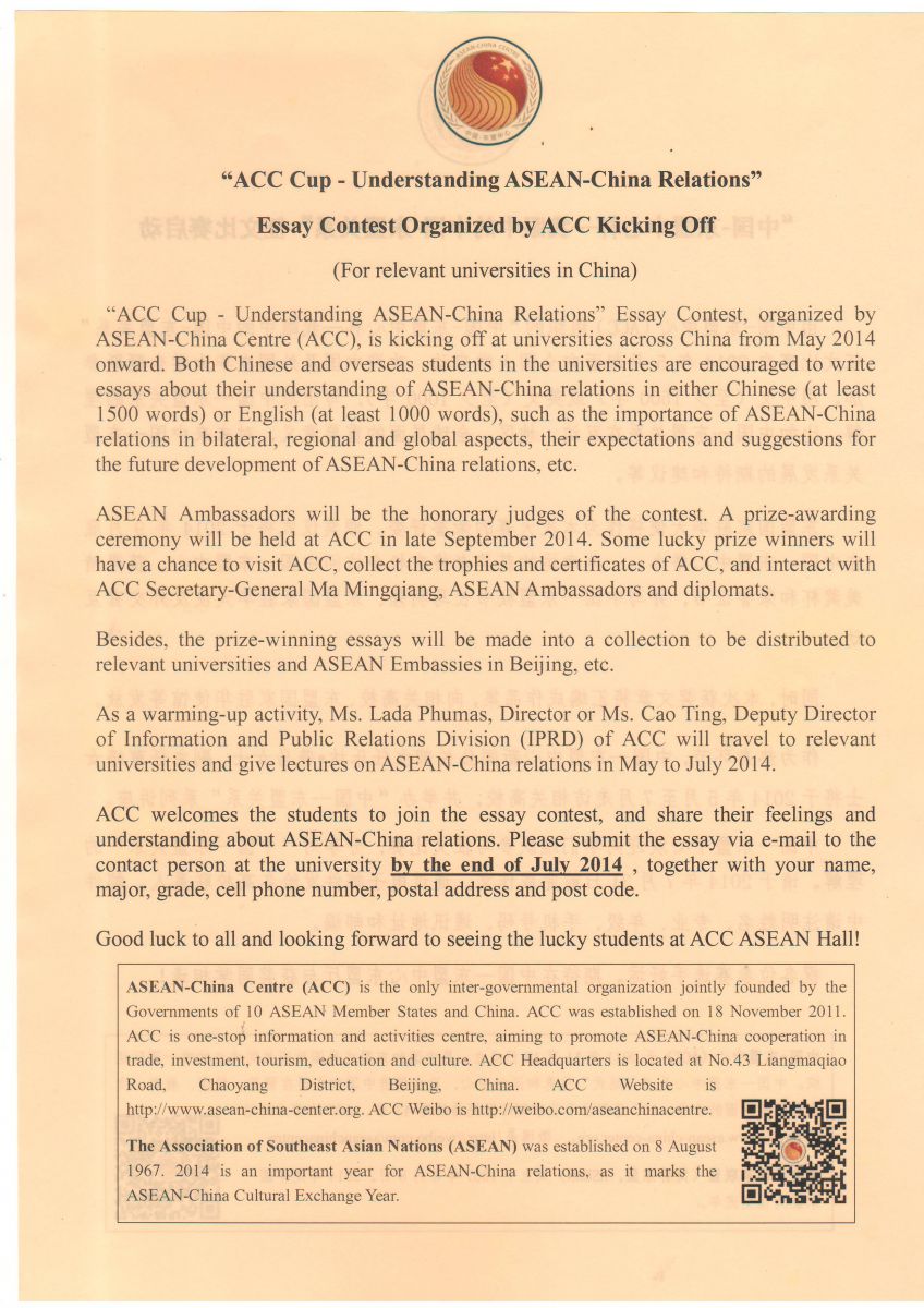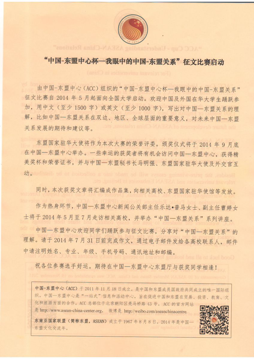 征文题材与体裁无限制,可以是学生在东盟某个国家或几个国家的游记、体会,或对中国-东盟关系的认识及建议,或其他与东盟有关的各类文章。ACC将对获奖学生文章进行中英文对译,制作中英文论文集,并将该书赠与项目院校及学生、东盟各国来访人员、东盟10国驻华大使及官员。